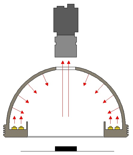 光源從底部發(fā)光,經(jīng)過多次漫反射形成無影光源,DOME光源是一種高均勻性的光源,適用于表面凹凸不平、反光物體檢測。