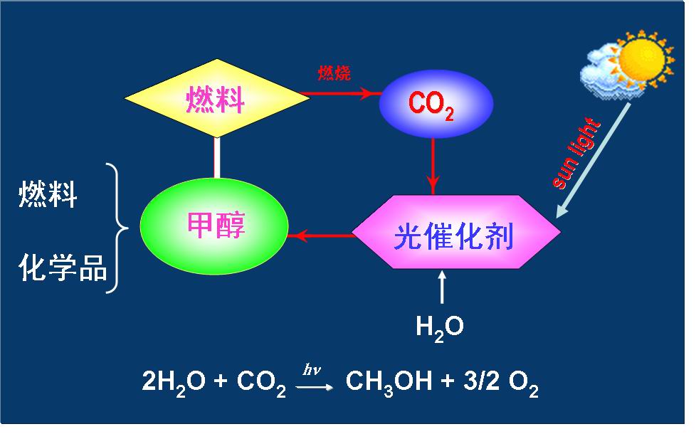 其一是經(jīng)太陽(yáng)能化學(xué)和生物轉(zhuǎn)化分解水制氫,然后將氫與CO2經(jīng)傳統(tǒng)的光催化轉(zhuǎn)化為甲醇,和其他的化學(xué)品,即:H2O → H2 + 1/2O2,H2 + CO2 → CH3OH,凈反應(yīng):H2O + CO2 → CH3OH + O2↑。此過(guò)程的關(guān)鍵科學(xué)問(wèn)題是:(1)開(kāi)發(fā)高效光催化劑;(2)將光催化制取的氫從反應(yīng)體系中有效分離,并與CO2催化轉(zhuǎn)化耦合。