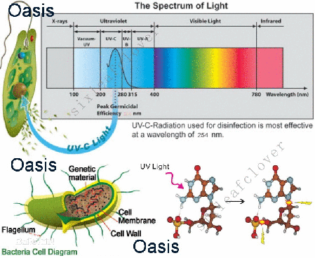 波長在240~280nm范圍內(nèi)的紫外線可以破壞細(xì)菌病毒DNA(脫氧核糖核酸)或RNA(核糖核酸)的分子結(jié)構(gòu),造成生長性細(xì)胞死亡和(或)再生性細(xì)胞死亡,達(dá)到滅菌消毒的效果。尤其是波長為254nm的紫外線,滅菌消毒的效果強(qiáng)且不會產(chǎn)生臭氧造成二次污染。有待于進(jìn)一步發(fā)展和研究。