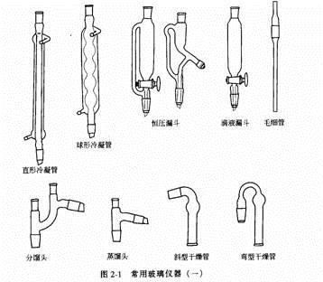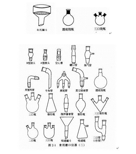 在精細有機合成實驗中使用的一般為標(biāo)準(zhǔn)磨口玻璃儀器。它的用途、容量不同,應(yīng)注意標(biāo)準(zhǔn)磨口有不同的編號,如 10 號、 14 號、 19 號、 24 號、 9 號和 34 號等。這些編號是指磨口大端的直徑 ( 單位為 mm ,取接近的整數(shù) ) 。洗滌磨口時不得用粗糙的去污粉,以免使磨口擦傷而漏氣。進行真空減壓操作時,磨口處應(yīng)涂以真空潤滑脂,以免漏氣。一般用途可不涂潤滑脂,以免砧污反應(yīng)物或產(chǎn)物。若反應(yīng)中有強堿,則應(yīng)涂潤滑劑,以免磨口連接處因堿腐蝕粘牢而無法拆開。精細合成實驗所需常用玻璃儀器見圖 2-1 。