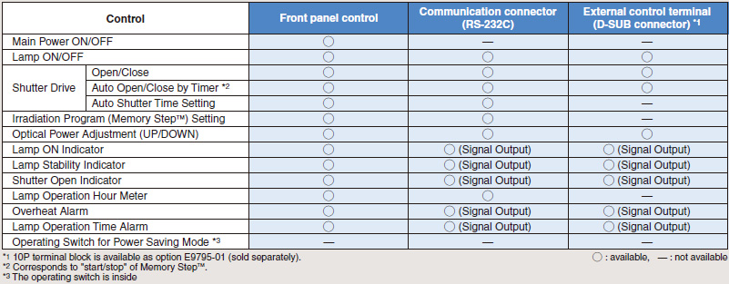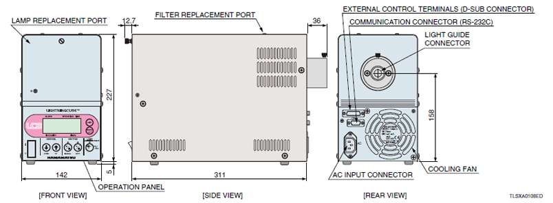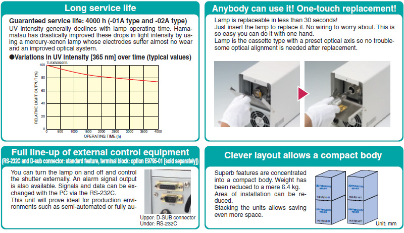 點光源采用長壽命高光強的汞氙燈和光損耗小化的光學系統(tǒng)。我們的紫外點光源因長壽命和高功率而獲得良好的聲譽,正在各種領域扮演著重要角色,尤其是FA(工廠自動化)。紫外點光源產(chǎn)生更少的熱量,因此能理想用于易熱損的微元件和光學元件的粘結時的紫外固化。[光導插口:背面,燈管更換位置:操作面板(前面)]